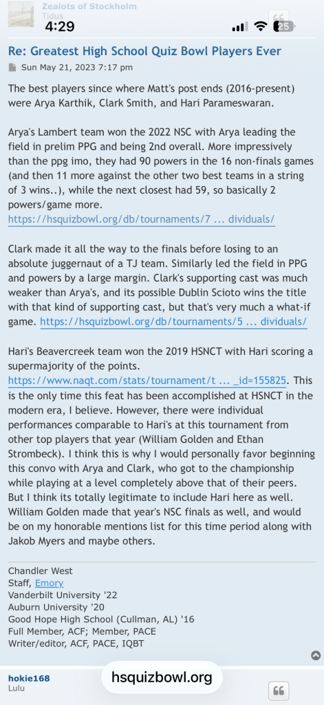 When others were referring to Aadi Arya Karthik as a top 3 generational player in high school quiz bowl …