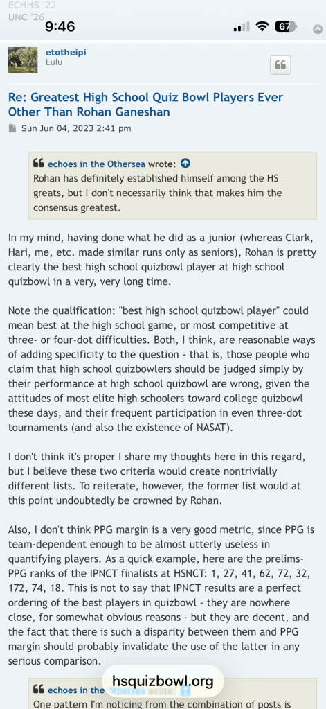 Note the qualification: “best high school quizbowl player” could mean best at the high school game, or most competitive at three- or four-dot difficulties. Both, I think, are reasonable ways of adding specificity to the question – that is, those people who claim that high school quizbowlers should be judged simply by their performance at high school quizbowl are wrong, given the attitudes of most elite high schoolers toward college quizbowl these days, and their frequent participation in even three-dot tournaments (and also the existence of NASAT).
